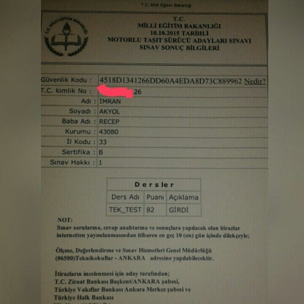 ehliyet sinav harci yatirma 2020 ziraat atm